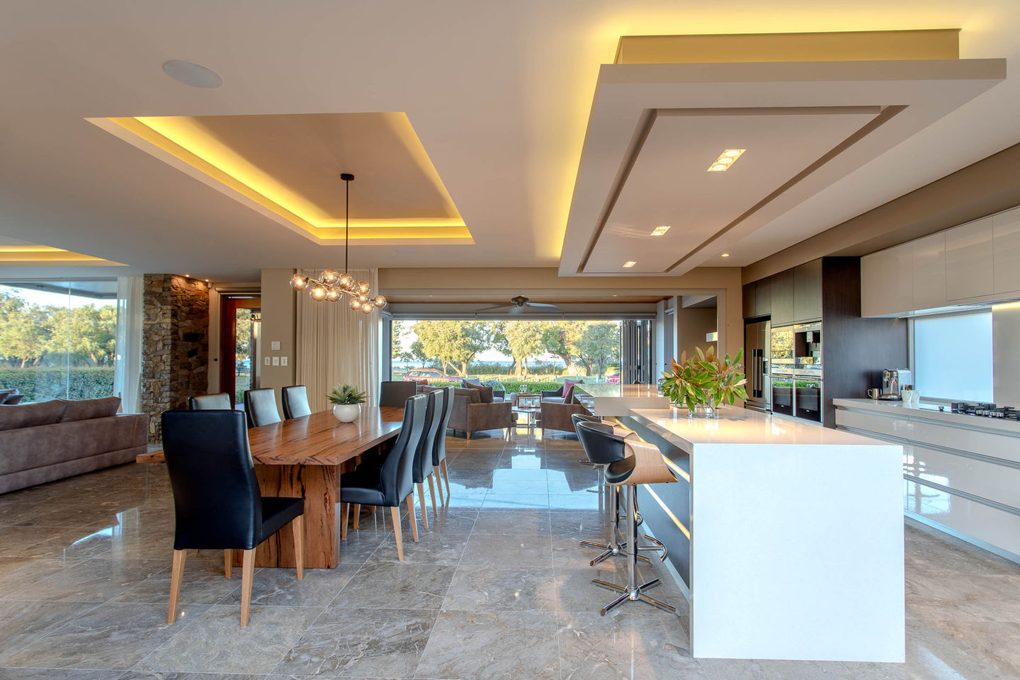 Bayview Bliss is a contemporary home built for entertaining in style. A large alfresco area with all the trimmings is situated at the front of the home to maximize views of the ocean and leafy foreshore just across the street. With this property, we supplied and installed the open living-dining area with Australian made lounges, dining table, and coffee table. The client required hard-wearing construction & durable fabrics by using Marri Timbers for the dining table and coffee table. Beachcomber lounges are covered in Warwick: Eastwood creating comfort and durability.
